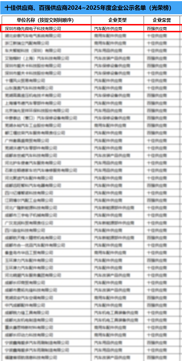 同時(shí),穩(wěn)先微登上“百?gòu)?qiáng)供應(yīng)商”企業(yè)光榮榜公示名單,以對(duì)其在汽車領(lǐng)域中的突出貢獻(xiàn)進(jìn)行榮譽(yù)嘉獎(jiǎng)。
